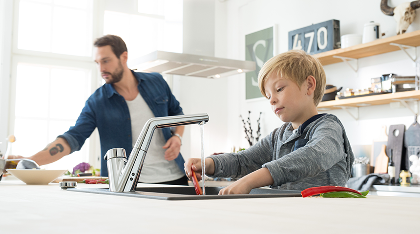 - Regularnie dezynfekuj baterię. Powierzchnia baterii to wymarzone środowisko dla bakterii. Wraz z każdym dotknięciem baterii brudną od tłuszczu ręką przenosimy na nią mnóstwo bakterii. Kiedy zakręcamy kran po umyciu rąk, bakterie podróżują z powrotem z baterii prosto na nasze dłonie. Miej zawsze czyste ręce, a najlepiej: zainwestuj w baterię bezdotykową bądź hybrydową, a problem zniknie na zawsze.